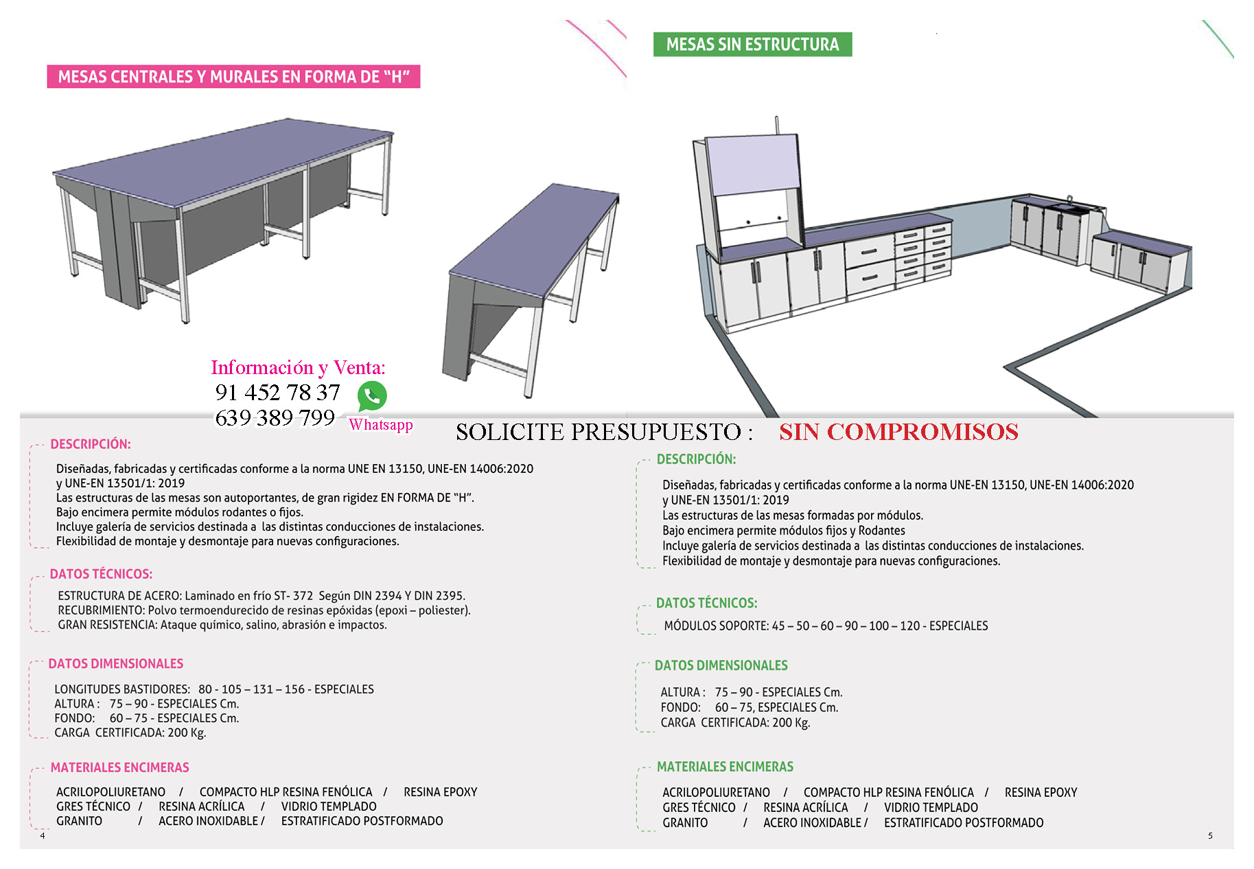 Si está buscando mobiliario para laboratorios, mesas de trabajo o estudio, cajoneras, muebles auxiliares, armarios o separaciones de espacios y mesas de trabajo . Tenemos el mobiliario ideal para usted con todo tipo de formatos y medidas estandar o incluso a medida bajo consulta. Material con encimeras terminadas con acabados fenólicos con alta resistencia de primera calidad con un diseño adecuado pensado únicamente para uso intensivo en puestos de trabajo para laboratorios con una alta durabilidad y controles de calidad. Encimeras con recubrimiento de resinas epóxidas de gran resistencia a agentes químicos, salino, abrasión e impactos