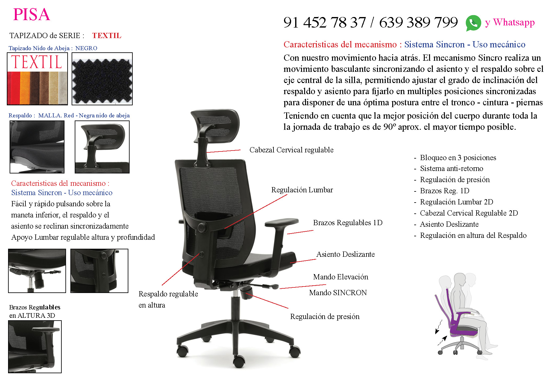 • Mecanismo: Reclinación SINCRON 3P y elevación a gas mediante pistón